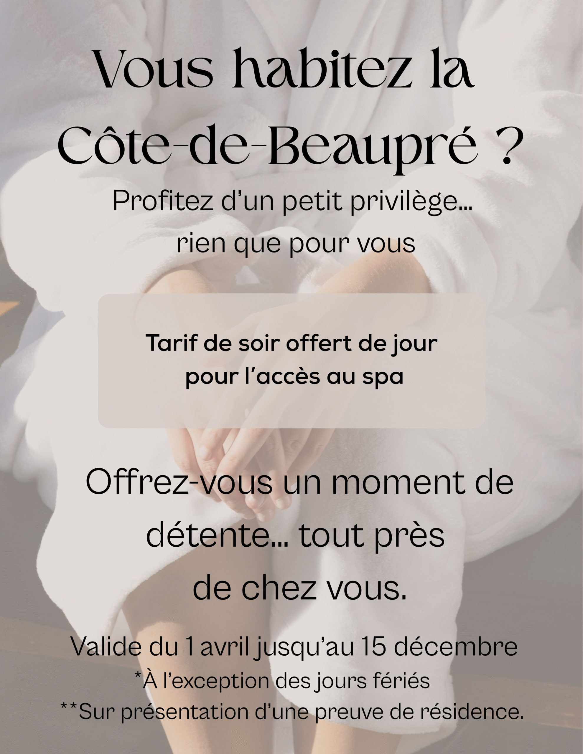 Le Spa Le Versant Mont-Sainte-Anne est fier d’offrir une promotion spéciale aux résidents de la région : profitez du tarif du soir, en tout temps, même durant la journée.
