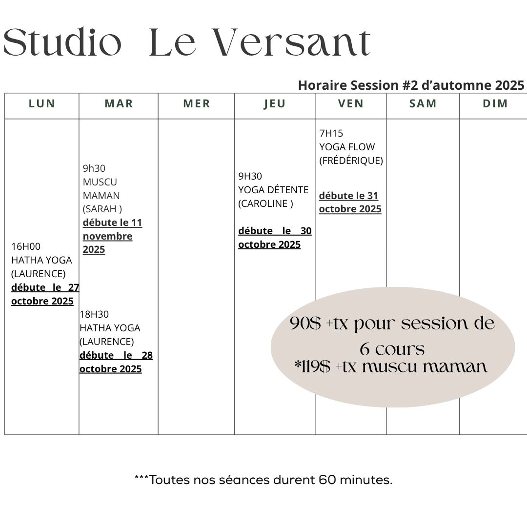Les sessions d’automne de yoga au Versant arrivent à grands pas. Cette saison, les cours seront offerts sous forme de sessions de 6 semaines, afin de favoriser une pratique régulière et un meilleur encadrement.